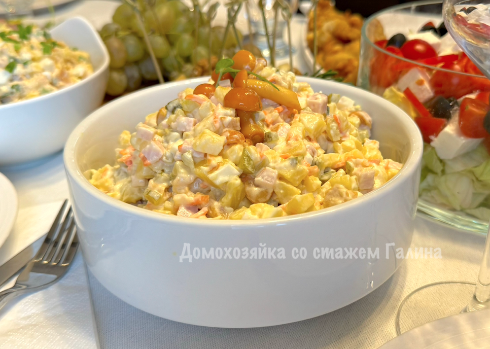 Здравствуйте, дорогие читатели! На моем канале уже собрано множество рецептов салатов с разнообразными составляющими. Сегодня хочу поделиться рецептом вкусного сытного салата, который я подала на праздничный стол в честь Дня рождения мужа. Для достижения идеального вкуса, конечно, предпочтительно использовать свои, собственноручно замаринованные грибочки — например, белые или подосиновики. Однако, если они отсутствуют, не стоит отчаиваться, покупные грибы вполне подойдут, главное, чтобы они были вкусными, так как именно это определяет общий вкус блюда. На этот раз у меня закончились домашние маринованные грибы, и я использовала покупные маринованные опята — и с ними салат вышел на удивление великолепным. В качестве основного ингредиента я взяла варено-копченый карбонад, но его можно заменить на вареную или запеченную курицу, говядину, язык или ветчину. Картофель сварила в мундире, остудила, очистила и нарезала на кусочки. Карбонад нарезала на меленькие кусочки и отправила в салатник. Д