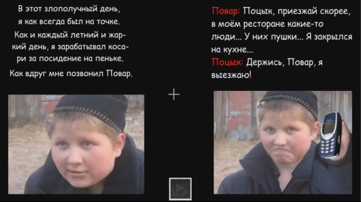 Приехав на место преступление, Поцык поднялся на лифте на второй этаж и увидел, что на Повара напали три Гомогея с пистолетами, которые кричат: «Ты попал!»