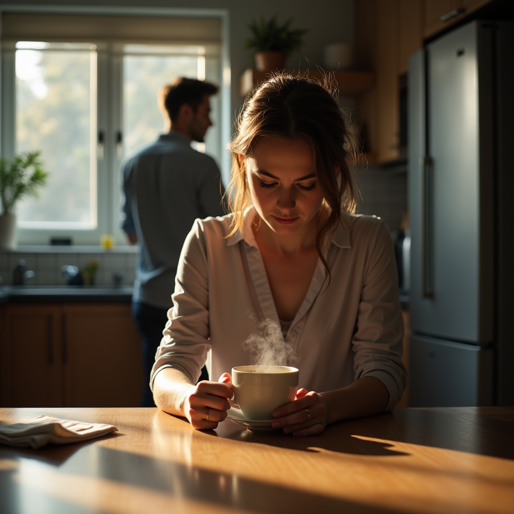 Она замерла. Ее пальцы скользили по краю чашки, как будто этот тонкий ободок был спасательным кругом. Губы дрогнули, но слова не вышли.
