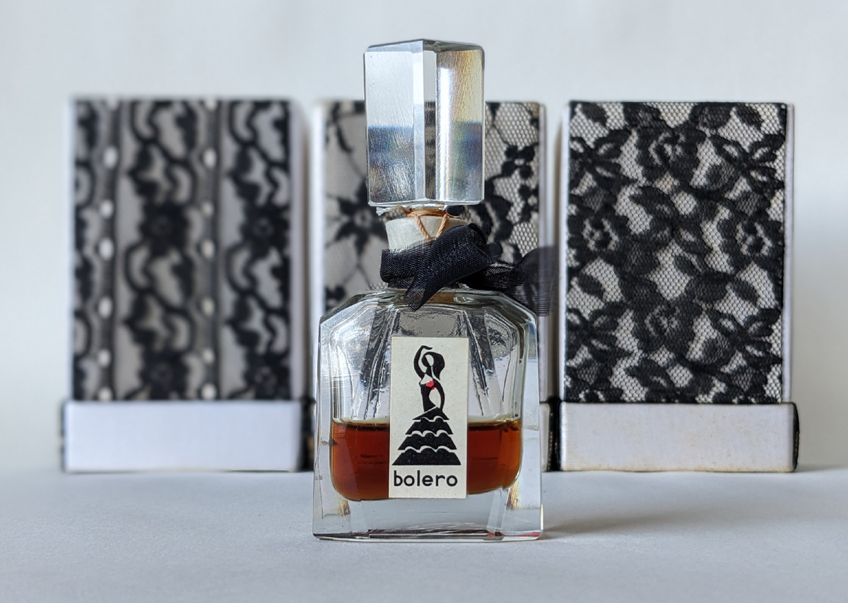 Духи "Болеро" были придуманы Б.А. Шварцман 1968 году - в "золотом веке" Дзинтарса, когда считалось, что оформление должно подчеркивать драгоценность и роскошь ароматов. Но в начале 1970-х подход парфюмерных производителей к дизайну своей продукции совершенно изменится, и с этого момента все дзинтаровские новинки станут выходить в винтовых флаконах (кроме двух исключений, "Шарма" и "Колдуньи"), а их коробки будут декорироваться только бумагой. Правда, выпуск старых хитов в притертых флаконах и парадных коробках, вроде "Рижской сирени", "Рижанки", "Консуэло", "Латвии", "Иоланты", "Мадригала", продолжился, но в основном на экспорт и, видимо, под заказ - этим и объясняется наличие некоторых из них в дзинтаровских каталогах для экспортеров аж до 1991 года при полной уверенности рядовых покупателей, что их любимцев давно сняли с производства. В винтажных каталогах запах "Болеро" описывали как пикантный и горьковатый. Если все-таки попытаться переложить такую характеристику на привычный совре