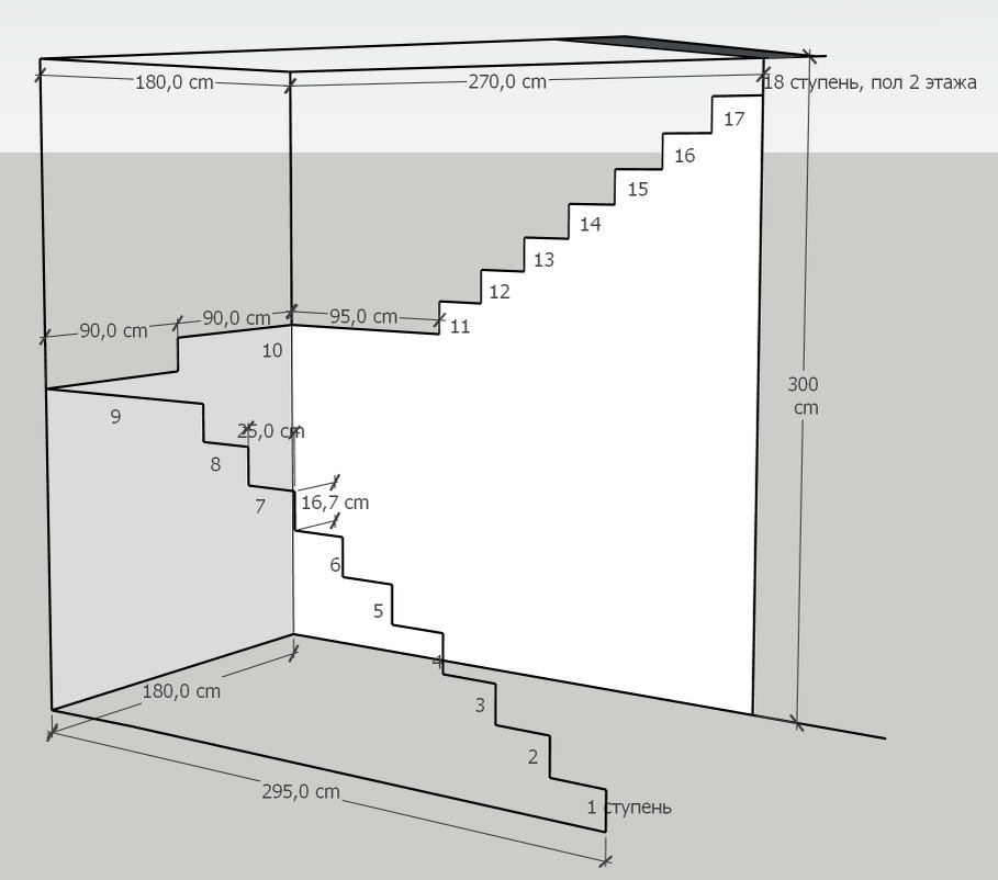 Начало. Даны первоначальные данные для расчета данного примера. Здесь можешь узнать какой размер ступеней и площадки выбрать, чтобы было удобно и не дорого? загляни сюда Чтобы длина проем на втором этаже был немного короче, чем длина проема на первом этаже, для этого, надо распределить больше ступеней на первом трапе. В примере, надо построить 17 ступеней, тогда 9 ступеней будут на 1 марше, остальные 8 - на 2 марше. 8 ступеней * 250 (проступь) + 950 (площадка) = 2950 мм - длина проема на 1 этажа Так как на втором трапе надо построить 7 ступеней, тогда 7 ступеней *250 (проступь)+950 (площадка) = 2700мм - длина проема на 2 этаже Пиши в комментарии любые вопросы, которые тебе интересны по лестницам Расчет проема для Прямой лестницы. Расчет Прямой лестницы. Расчет проема для Г-образной лестницы. Расчет Г-образной лестницы.