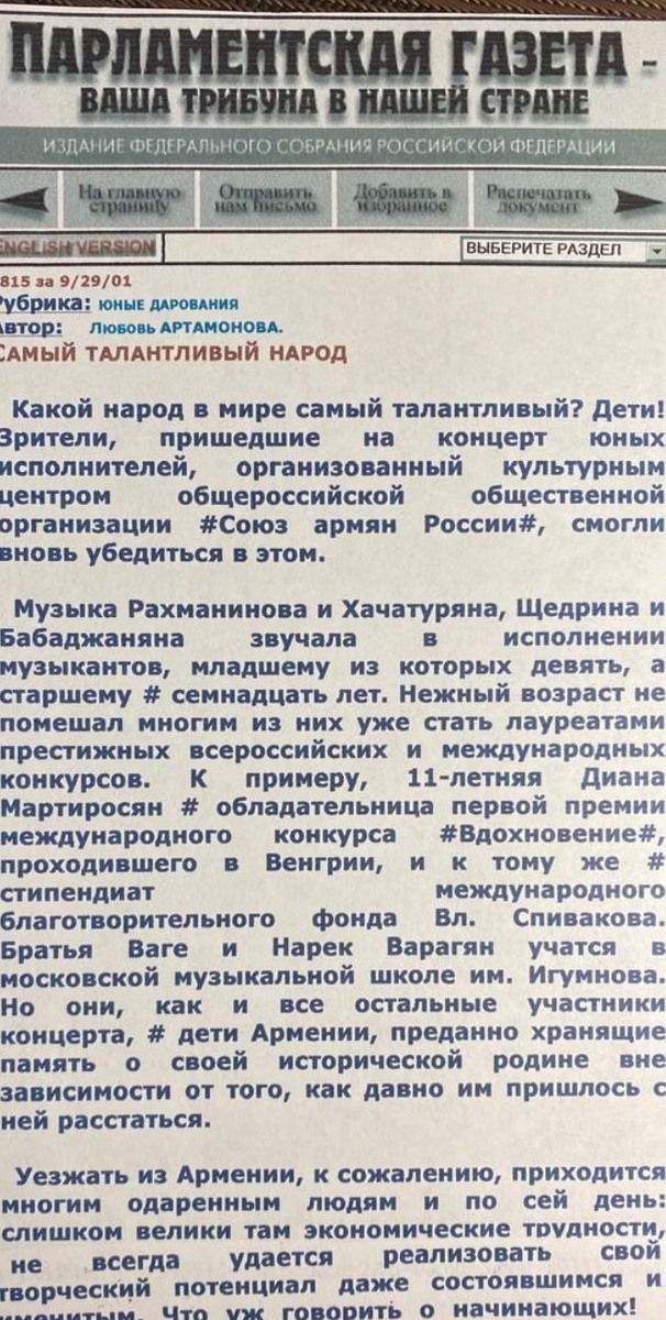Дорогие друзья! Я продолжаю новую рубрику «Скрипичный архив»! В этой рубрике я поделюсь с вами историями из своей жизни, которые формировали меня как музыканта и человека. Вы узнаете о моих первых шагах в мире музыки, о незабываемых концертах, встречах с интересными людьми и о том, что вдохновляет меня каждый день. Подписывайтесь! Приглашайте друзей и знакомых. С любовью и уважением, Вардан Маркос! "Самый талантливый народ Какой народ в мире самый талантливый? Дети! Зрители, пришедшие на концерт юных исполнителей, организованный культурным центром общероссийской общественной организации «Союз армян России», смогли вновь убедиться в этом. Музыка Рахманинова и Хачатуряна, Щедрина и Бабаджаняна звучала в исполнении музыкантов, младшему из которых девять, а старшему семнадцать лет. Нежный возраст не помешал многим из них уже стать лауреатами престижных всероссийских и международных конкурсов. К примеру, 11-летняя Диана Мартиросян обладательница первой премии международного конкурса «Вдо