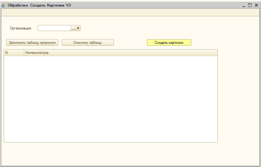 Форма проста : Выбираю организацию (у меня их несколько, у вас может быть одна) , заполняю таблицу "НоменклатураТаблица" запросом или вручную, кликаю "Создать карточку" и на всё что в таблице должны создаться технические карточки.