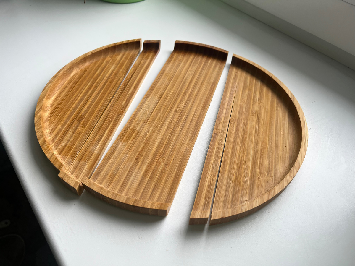 Начну с недавних заказов. Решила я на новогодних праздниках докупить посуду на стол. У меня уже имеется несколько деревянных сервировочных блюд разной формы. Захотелось приобрести еще одно - круглое в пару к похожему, которое у меня есть. Заказала на Оzon блюдо, но другой фирмы, в два раза дешевле. Сервировочная тарелка бренда, как у меня, стоила более 800 рублей. А та, что я выбрала, чуть больше 400. Думаю, попробую, закажу. Получила блюдо в пункте выдачи, оно было обтянуло плотно прозрачной пленкой. Осмотрела, ничего не заметила, забрала домой. Моя ошибка, что я на месте не стала распаковывать товар. Дома, уже спустя только неделю, сняла упаковку и заметила приличную трещину.