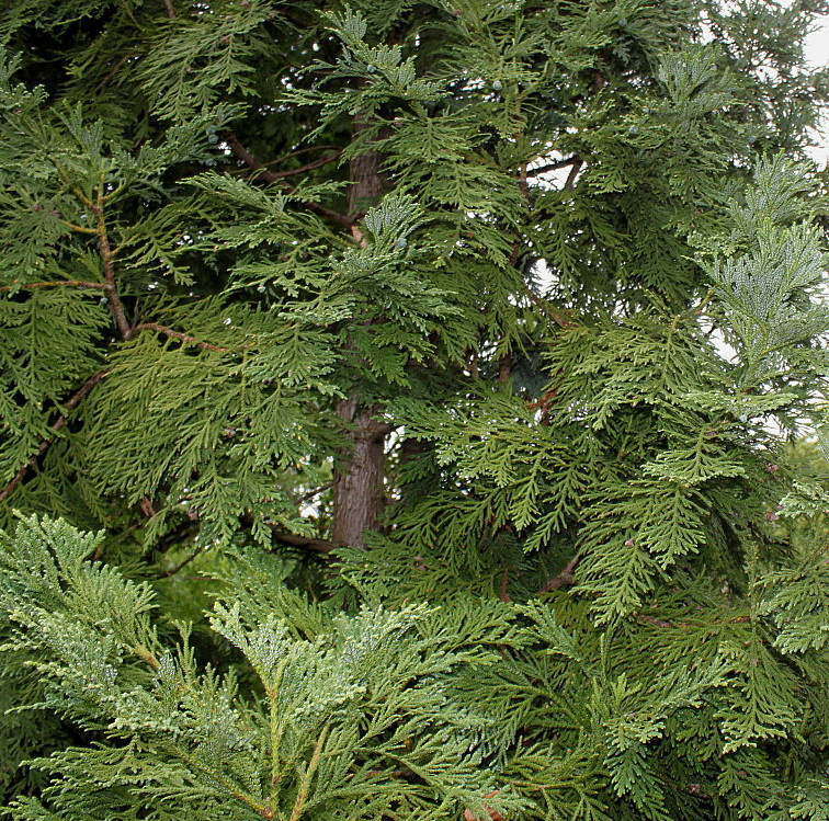 Туевик поникающий (Thujopsis dolabrata) – это хвойное дерево семейства Кипарисовые (Cupressaceae), родное для Японии. Туевик поникающий – одно из самых декоративных хвойных растений, которое часто используется в ландшафтном дизайне благодаря своей красивой форме и необычной хвоей. Туевик поникающий представляет собой медленнорастущее дерево с широкой пирамидальной или конусообразной кроной, достигающее высоты 15–20 метров в естественных условиях. В культуре это дерево часто остается меньших размеров. Диаметр ствола может достигать 50 см у зрелых деревьев. Кора гладкая и серебристо-серая, а ветви растут горизонтально и постепенно наклоняются вниз, что придает дереву элегантный вид. • Относится к группе: хвойные растения.
