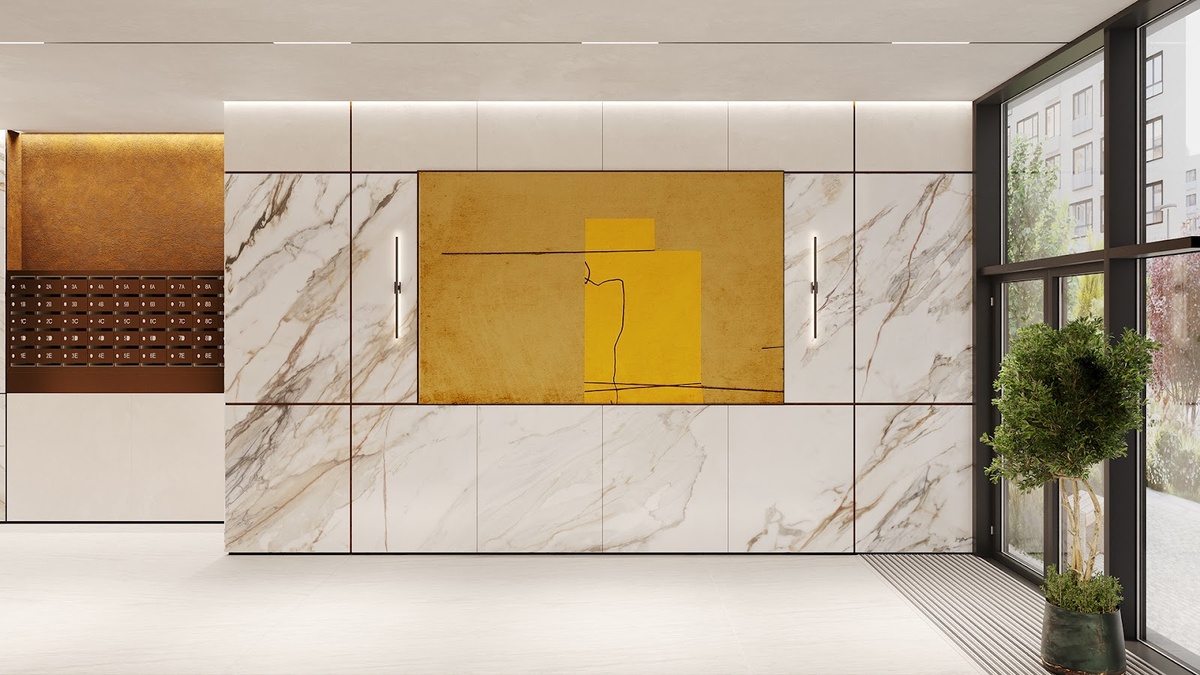 Места общего пользования (МОПы) имеют важное значение в формировании облика современного жилого комплекса. Когда-то это были просто функциональные зоны — лестницы, коридоры и лифтовые холлы. Однако с развитием архитектуры и дизайна эти пространства стали неотъемлемой частью концепции дома. Кладовые, колясочные, стильные лобби, которые напоминают лаунж-зоны, становятся стандартом качественного жилья. Места общего пользования В квартале «Гранатовый» МОПы спроектированы так, чтобы объединить современный стиль и практичность. Здесь используются качественные материалы, которые делают интерьер выразительным и долговечным. Особое внимание уделено деталям отделки. Кортеновская сталь с теплым оранжево-коричневым оттенком придает пространствам характер и гармонично сочетается с другими материалами, а крупноформатный керамогранит с текстурой мрамора добавляет объем. Цветовые решения вдохновлены природой региона. Материалы, которые украшают интерьеры и органично связывают архитектуру с окружающим