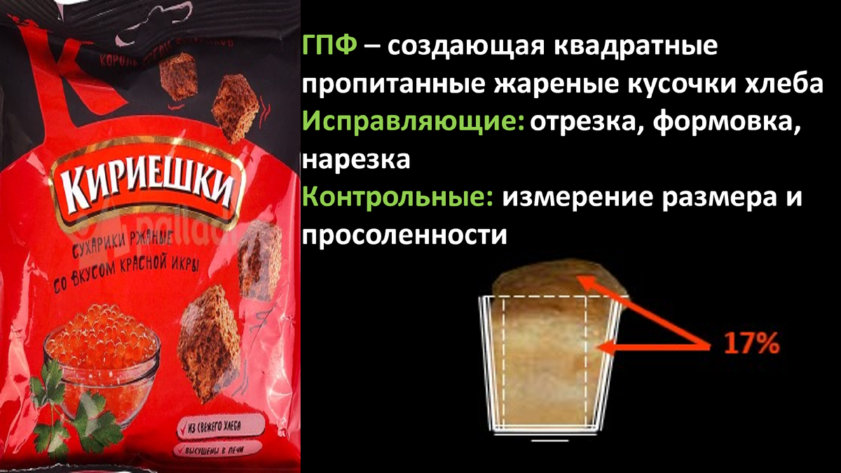 ТРИЗовцы применили этот подход при производстве «Кириешек». Там столкнулись с проблемой большого отхода сырья: в крупных «корзинах» для выпечки хлеб плохо пропекался и просаливался внутри. К тому же, чтобы придать ему квадратную форму, срезали края и верхушку — на это уходило 17% продукта. Пройдя по технологической линии и почесав лысины, специалисты решили: «Уберём исправительные и контрольные функции, пусть их выполняют другие элементы системы».
