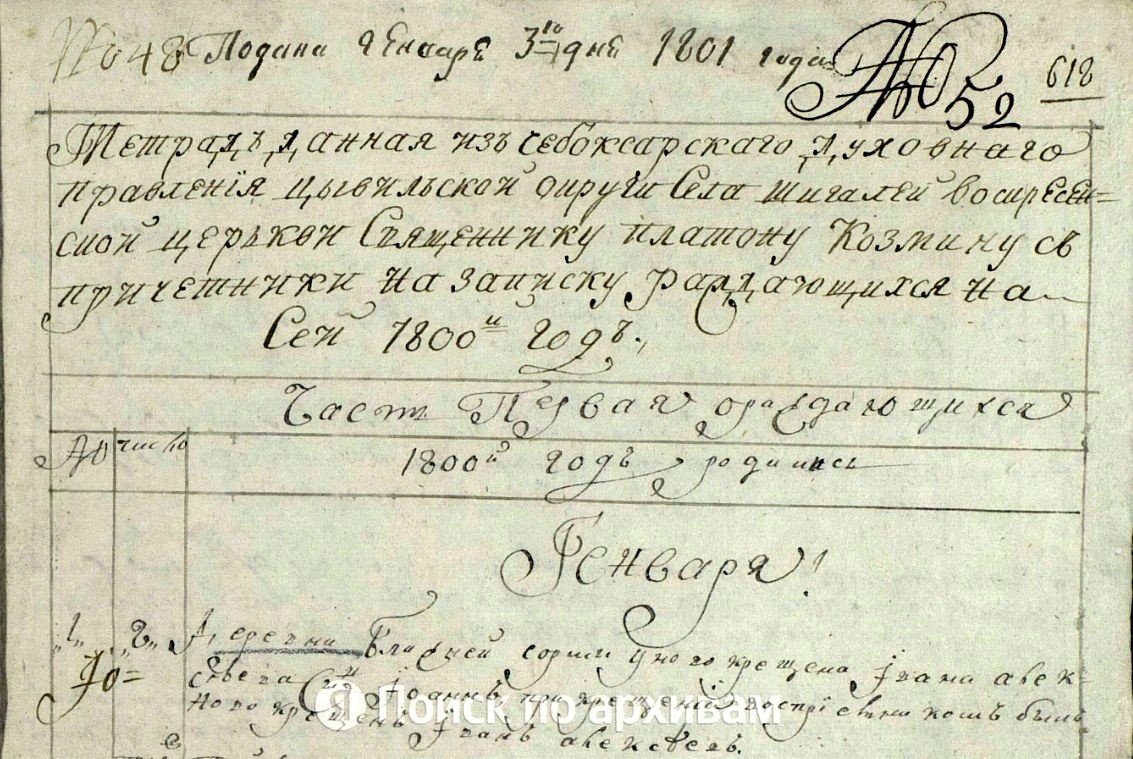 Тетрадь данная Чебоксарского Духовного правления Цывильский округи села Шигалей Воскресенской церкви священнику Платону Козмину с причетники на записку рождающихся на сей 1800-й год.