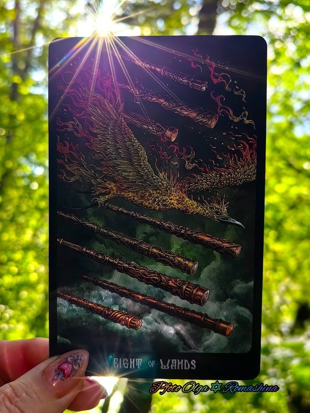 Восьмерка Жезлов служит индикатором «всего быстрого» - гонок, электронной почты. Это «экспресс»карта, и стрел любви это тоже касается. Это не тот случай, когда люди долго присматриваются, принюхиваются и притираются друг к другу. Тут оглянуться не успеешь, как обнаружишь, что голова потеряна, влюбленность прогрессирует и события развиваются на пятой скорости.
