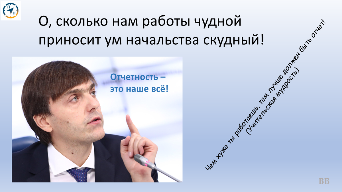 Какой руководитель хорош? Такой, который не только обладает лидерскими качествами, имеет менеджерское образование, но и хорошо знает то дело, которым занимаются его подчиненные. Такой руководитель знает систему, понимает ее, разбирается в тонкостях работы сотрудников, может творчески планировать процессы, четко формулировать задачи и понимать, как они выполняются. Если же директор школы или кто повыше не имеют такого опыта, либо не умеют руководить, не понимают системы, то они нуждаются в специальном оправдании своего существования. В качестве такого оправдания используются всевозможные планы и отчеты, которые никак не влияют на качество работы подчиненных, кроме как отвлекают этих самых подчиненных от той работы, которую они должны выполнять. Один мой знакомый руководитель довольно высокого уровня когда-то меня учил: «Если ты понимаешь, чем заняты твои работники, то ты больше занимаешься мотивацией и мягким, желательно незаметным, контролем. Отчеты специалистов не нужны, а вот советов
