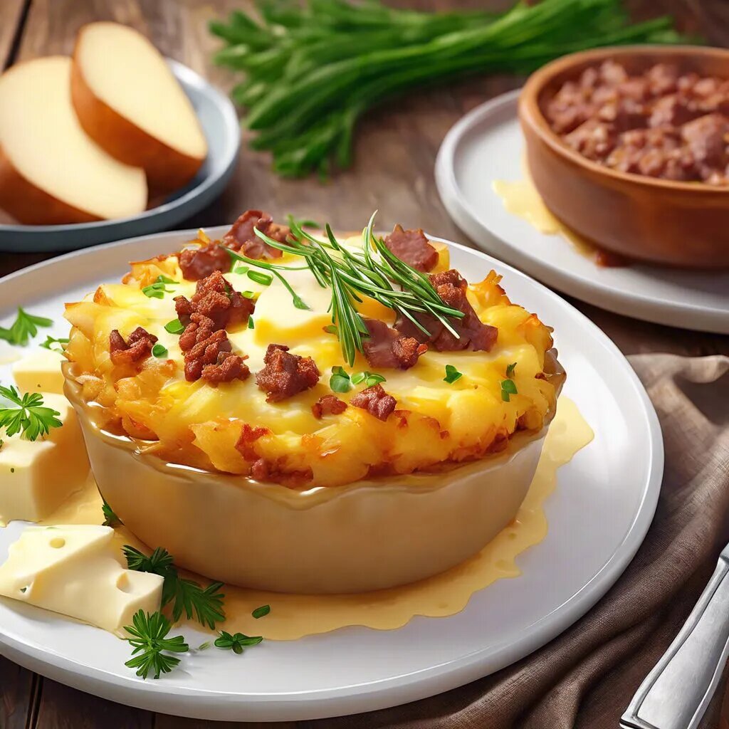 Ингредиенты: - 1 кг картофеля - 300 г мясного фарша (говядина, свинина или курица) - 1 луковица - 2 яйца - 200 мл сметаны - 100 г сыра (по желанию) - Соль, перец и специи по вкусу - Масло для жарки ### Приготовление: 1. **Подготовка картофеля**: Очистите картофель и нарежьте его тонкими кружочками или натрите на терке. Если нарезаете кружочками, можно предварительно отварить их в подсоленной воде 5-7 минут, чтобы они стали мягче. 2. **Обжарка лука**: Мелко нарежьте лук и обжарьте его на сковороде с растительным маслом до золотистого цвета. 3. **Приготовление фарша**: Добавьте к луку мясной фарш, посолите и поперчите по вкусу. Обжаривайте до готовности, постоянно помешивая. 4. **Сборка запеканки**: В глубокой форме для запекания выложите половину картофеля, затем равномерно распределите мясной фарш с луком и сверху укладывайте оставшийся картофель. 5. **Приготовление заливки**: В миске взбейте яйца со сметаной, добавьте немного соли и перца. Получившуюся массу равномерно вылейте на запе