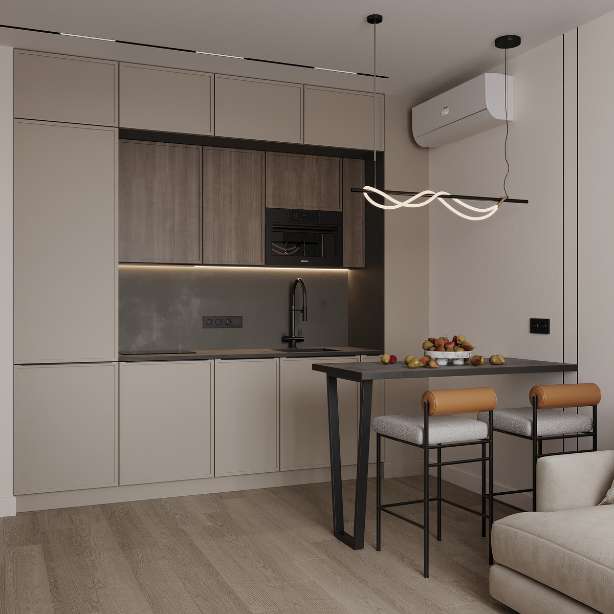 Встройте бытовую технику в мебель или используйте модели с необычным дизайном, которые гармонично вписываются в интерьер. Это может быть, например, холодильник, встраиваемый в шкаф; варочная поверхность, интегрированная в столешницу, или вытяжка необычной формы, которая становится частью декора. Скрытая техника не загромождает пространство и делает кухню более стильной и лаконичной.