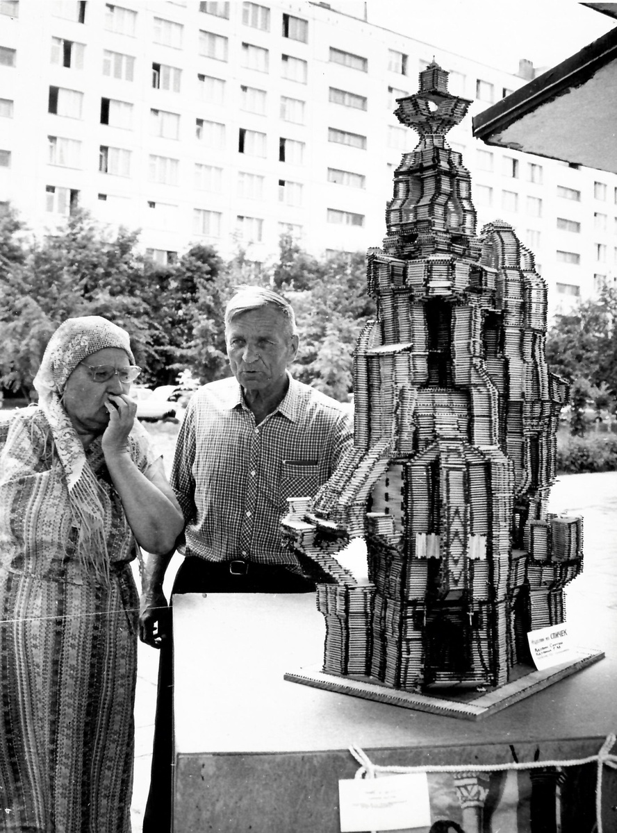 Посмотрите фотографию, сделанную летом 1988 года на бульваре Энтузиастов, на которой запечатлён Сергей Вдовин с супругой рядом со своим творением – замком, сделанным из обычных спичек. Дело в том, что 20 и 21 августа 1988 года в городе Набережные Челны проходил праздник народного творчества «Город мастеров». Прочтите анонс праздника, опубликованный в газете «Рабочий КАМАЗа» от 18 августа 1988 года.