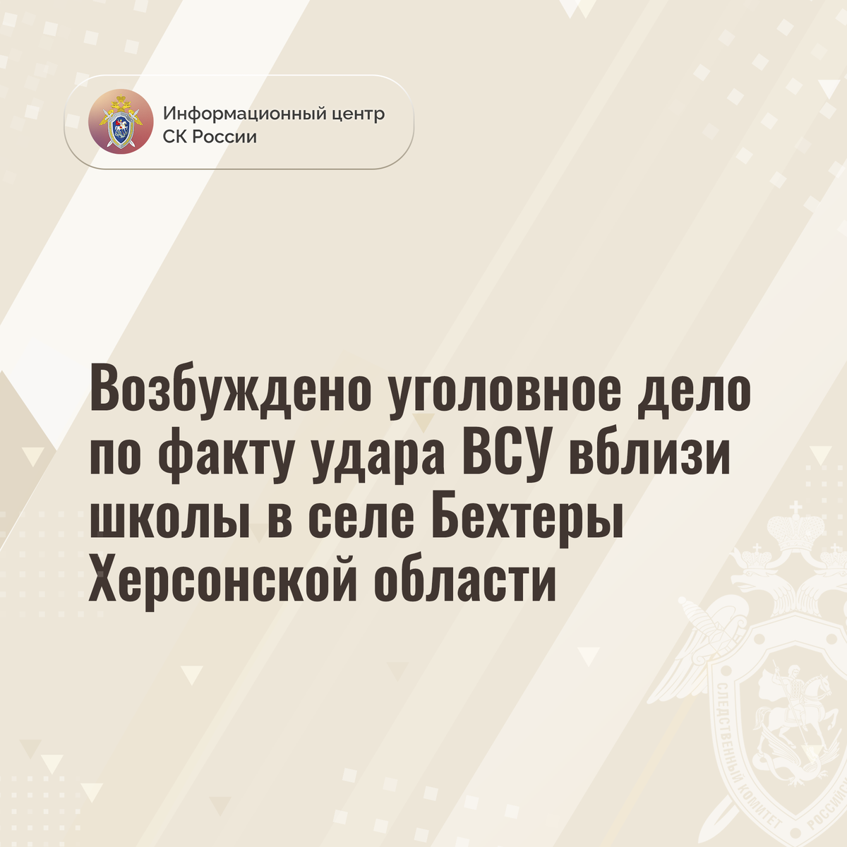 По факту удара ВСУ вблизи школы в селе Бехтеры Херсонской области Главным следственным управлением СК России возбуждено уголовное дело по признакам преступления, предусмотренного ч.3 ст.30, ст.105 УК РФ (покушение на убийство двух и более лиц), ст.167 УК РФ (умышленное повреждение имущества).