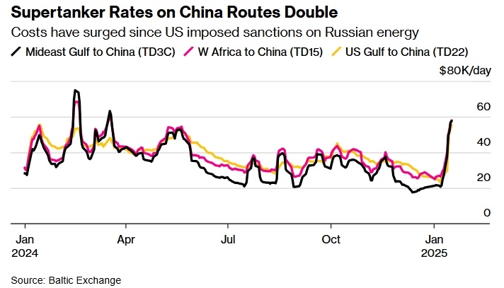 Ставки VLCC из стран Ближнего Востока в Китай выросли на 112% с 10 января. Издержки могут остаться высокими, если Трамп нацелится на иранские потоки сырой нефти Стоимость аренды супертанкера для перевозки нефти по ключевым маршрутам в Китай удвоилась после введения США санкций против России. Это свидетельствует о том, насколько сильно этот шаг повлиял на мировой рынок морских перевозок. Санкции привели к значительным изменениям на рынке грузоперевозок, который до недавнего времени сталкивался с ограниченным спросом из-за ограничений поставок, замедления экономического роста в Китае и снижения напряжённости на Ближнем Востоке. Количество подтверждённых рейсов осталось примерно на прежнем уровне, но количество доступных судов резко сократилось, а на некоторых маршрутах наблюдается острая конкуренция. Ставки на аренду супертанкеров на маршрутах в Китай увеличились вдвое. После введения США санкций против российской энергетической отрасли расходы резко возросли. Ставки на супертанкеры на м