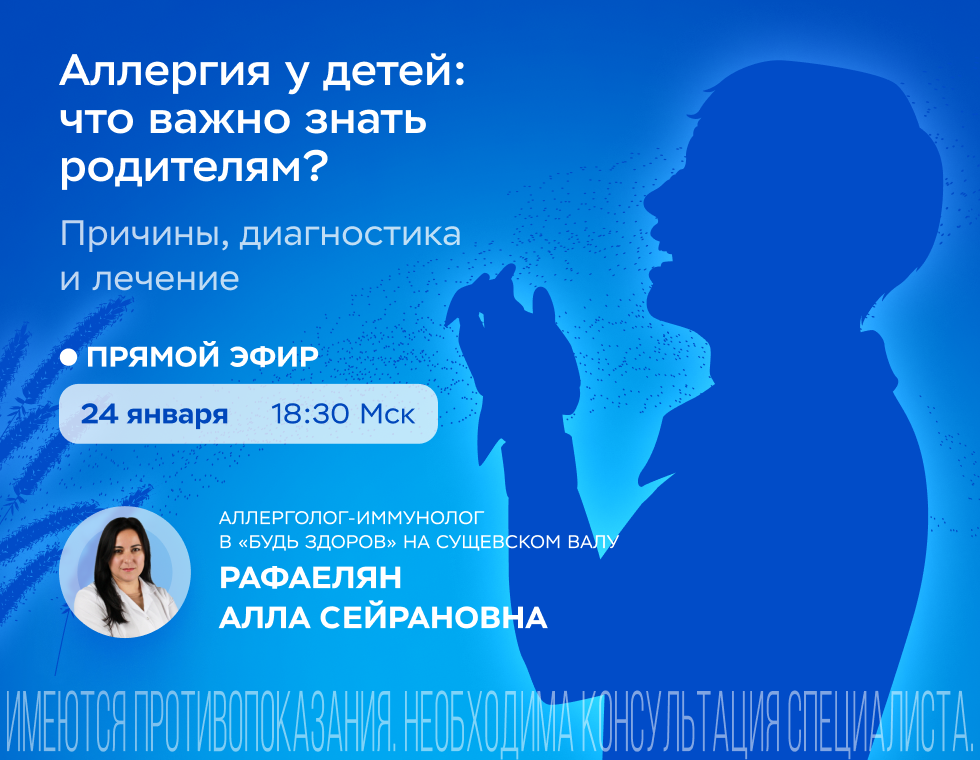 📌 Тема: Аллергия у детей. Что важно знать родителям? Причины, диагностика и лечение 📌 Когда: 24 января (пт) в 18:30 (мск) 📌 Где: Telegram-канал клиники "Будь Здоров". ССЫЛКА — https://t.me/Klinika_Bud_Zdorov/500 Каждый пятый ребёнок сталкивается с аллергией, и родители часто не знают, как правильно с этим справляться. Какие симптомы нельзя игнорировать? Как диагностировать аллергию? Можно ли её вылечить? На эти и другие вопросы ответит Рафаелян Алла Сейрановна — врач аллерголог-иммунолог "Будь Здоров" на Сущевском Валу, которая уже более 16 лет помогает детям справляться с разными видами аллергии. Что обсудим: ✅ Почему у детей развивается аллергия? ✅ Как отличить аллергию от простуды или других заболеваний? ✅ Современные методы диагностики и лечения. ✅ Как создать безопасные условия для ребёнка с аллергией? ✅ Советы по питанию, профилактике и уходу. Задавайте ваши вопросы в комментариях! Доктор обязательно ответит на все вопросы после проведения основной части эфира! Не упустите ша