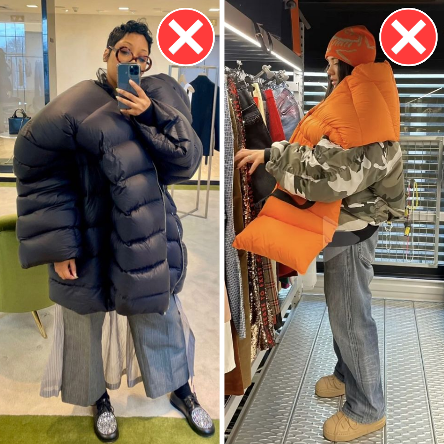 Откуда пошли такие вредные советы, не знаю, но предостерегаю, исключительно ради вашего стиля. Лучше купить пуховик в размер или даже чуть больше. Он должен сидеть свободно и не сковывать движений. И в этой визуальной легкости — секрет актуального образа.