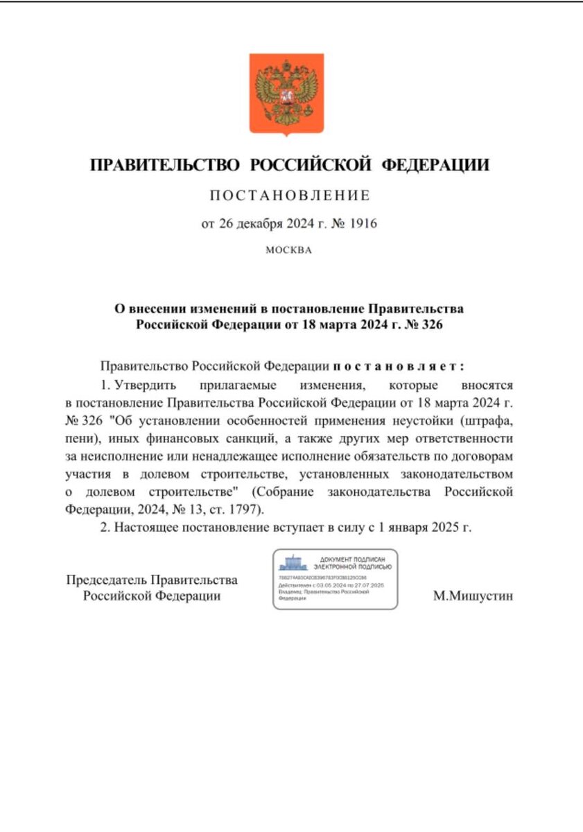 Правительство России продлило на полгода запрет на начисление неустойки застройщика за несданные вовремя объекты. Он будет действовать до 30 июня 2025 года. Такое постановление подписал премьер-министр страны Михаил Мишустин.