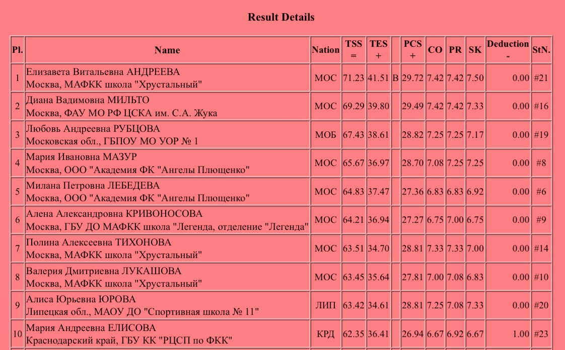 На этой неделе в Москве проходят всероссийские соревнования «На призы Президента ФФКМ». Турниров много не бывает, кроме того, это прекрасная возможность для юниоров отточить свои программы перед Первенством России. В стартовом протоколе была Екатерина Ципухина, но, к сожалению, на соревновательный лед она не вышла. 2A, 3F, 3Lz+3T. Нежно, симпатично. Потихоньку выбирается Милана из спада. Надеюсь, что на Первенстве России будет отличной форме. Она на 17-м месте по итогам этапов Гран-при и должна попасть на главный юниорский старт сезона. 64.83, 5 место. 3F, 2A, 3Lz+3T — неплохо. Кажется, что Маша стала поувереннее выступать. Не так часто мы видим чистые прокаты у этой фигуристки. Она не выступала на этапах и на Первенстве России мы ее не увидим. 65.67, 4 место. Валерия Лукашова (центр Этери Тутберидзе). Скромного оценили спортсменку. В прокате сделала: 3F, 2A, 3Lz+3T. Потеряла баллы на дорожке шагов, только 2 уровень. Каскад оказался не в плюсовой зоне и был не самый изящный выезд, но