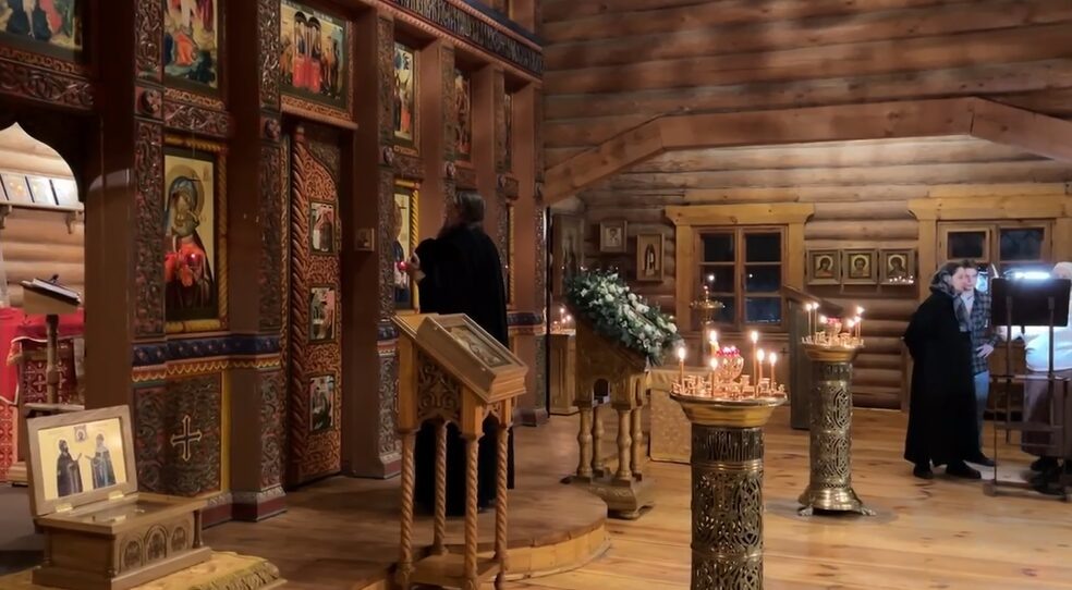 На кадрах священнослужитель и церковный хор распевают молитвы, а верующие крестятся.
