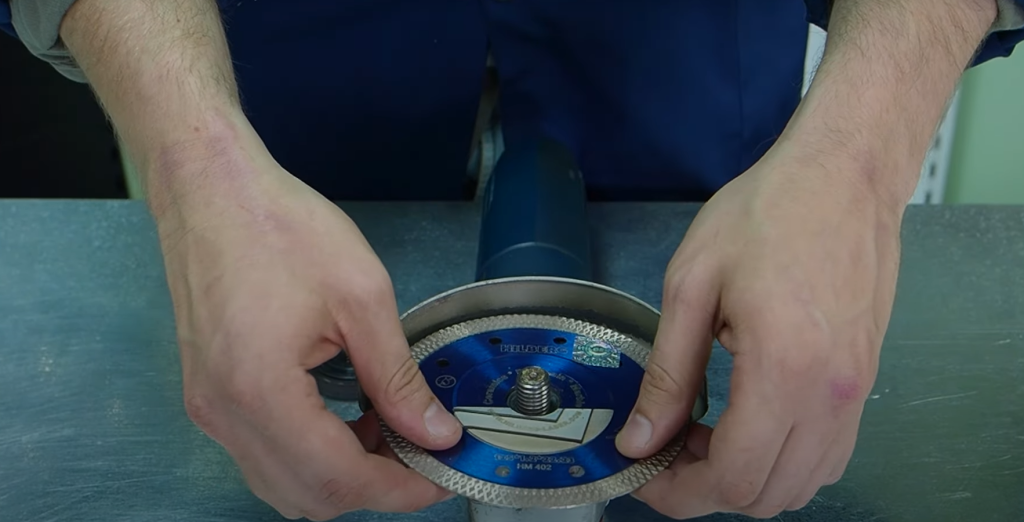 Приведите кожух УШМ в вертикальное положение и установите алмазный диск