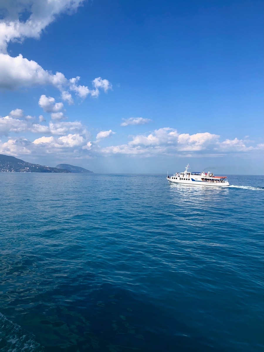 В знаменитое Ласточкино гнездо мы отправились из Ялты на теплоходе. Билеты можно приобрести в кассе №1 на центральной набережной Ялты и у ребят-распространителей с рупором, которые активно приглашают всех отправиться в морское путешествие. Общее время прогулки около 1 часа, без высадки. Стоимость, в которую входит экскурсия, составляет 600 рублей/человек. А за верхнюю палубу нужно доплачивать 100 рублей/человек. Рекомендую занимать места справа по ходу движения судна. На борту есть кафе и туалет, работают профессиональный фотограф (платный!), фото за штурвалом тоже за доп. плату (по стоимости не интересовалась) и гид-экскурсовод, по ходу движения рассказывал все подробности Ялты с историей. Мы поймали расслабляющую атмосферу. Можно никуда не торопиться, наблюдать за проплывающими мимо пейзажами и слушать экскурсовода. Экскурсия только в одну сторону, а на обратном пути просто можно расслабиться и насладиться видами. И если вы воспользовались услугами фотографа, он принесет ваши фото и