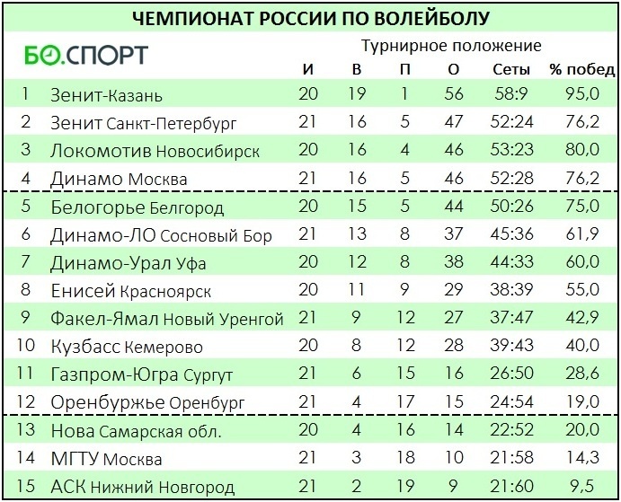 Сегодня матчем в Казани завершился 22-й тур мужского чемпионата России по волейболу. В регулярном чемпионате команды играют в два круга – по одному матчу с каждым соперником в гостях и дома. Четыре лучшие команды напрямую выйдут в четвертьфинал, а ещё восемь команд сыграют дополнительный раунд плей-офф. В турнире нечетное число команд. 22-й тур пропускает «Нова». Нажав на счёт матча, можно увидеть развёрнутую статистику. Чемпионат России. 22-й тур 17 января, пятница Факел-Ямал – Локомотив – 0:3 (22:25, 24:26, 23:25)Морозов (15), Капранов (13), Пипуныров (7) – Курбанов (14), Казаченков (12), Лызик (9) Динамо – Кузбасс – 3:1 (25:23, 25:18, 23:25, 25:16)Соколов (17), Жук (12), Богдан (11) – Пакшин (18), Супрунов (14), Маркин (10) 18 января, суббота Оренбуржье – Динамо-Урал – 0:3 (18:25, 25:27, 12:25)Хлякин (8), Коченов (7), Свентицкис (5) – Мельников (12), Сурмачевский (12), Урсов (10) Газпром-Югра – Белогорье – 1:3 (25:18, 19:25, 19:25, 15:25)Папазов (15), Масько (13), Родичев (11) – Тет