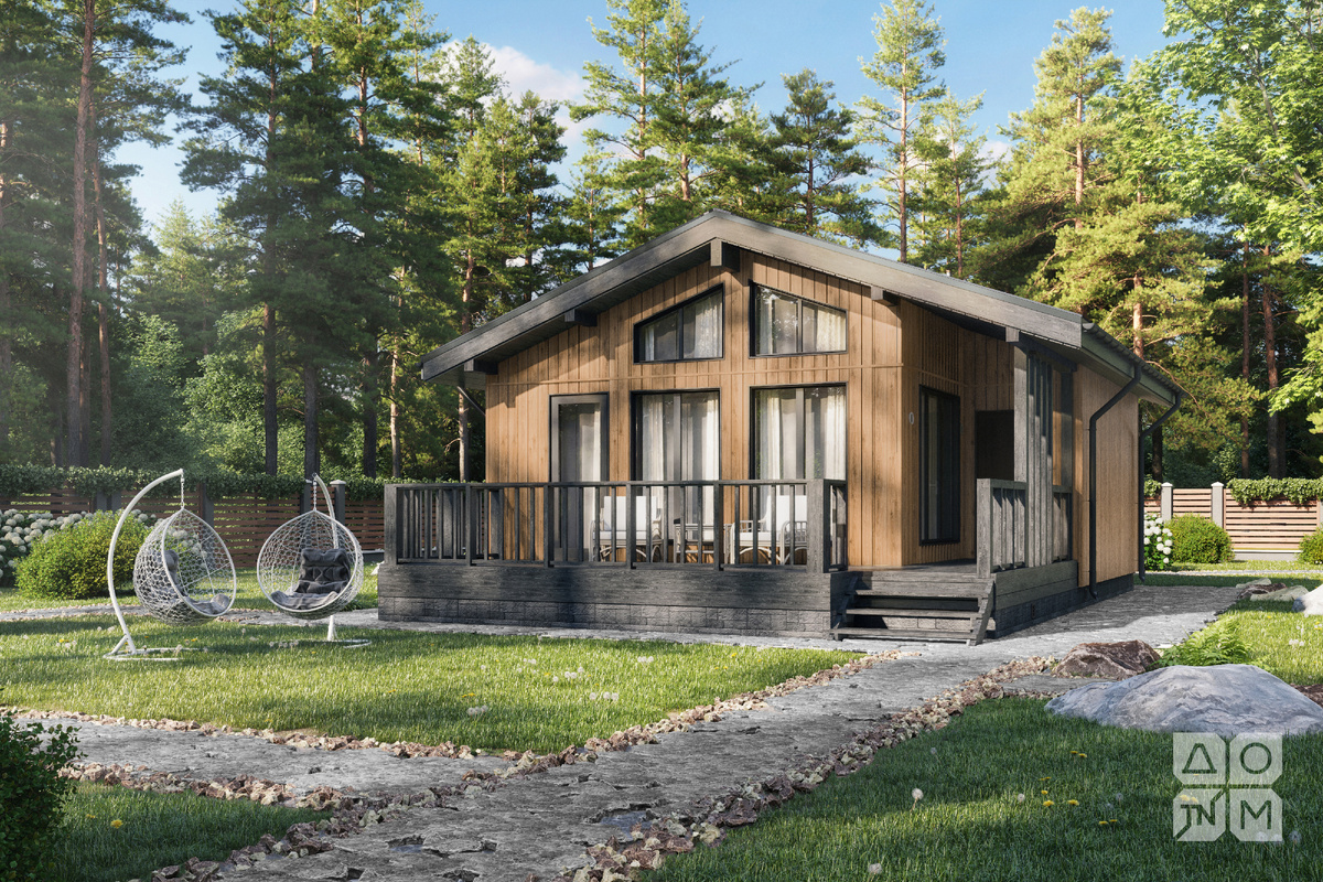 Каркасный дом заводского производства по проекту МОНЕ 49, общей площадью 73 м² с двускатной крышей, вторым светом. Стоимость строительства в комплектации "Тёплый контур с отделкой фасада" 5 300 000 руб. Планировка: Гостиная - кухня: площадью 26 м², со вторым светом,
