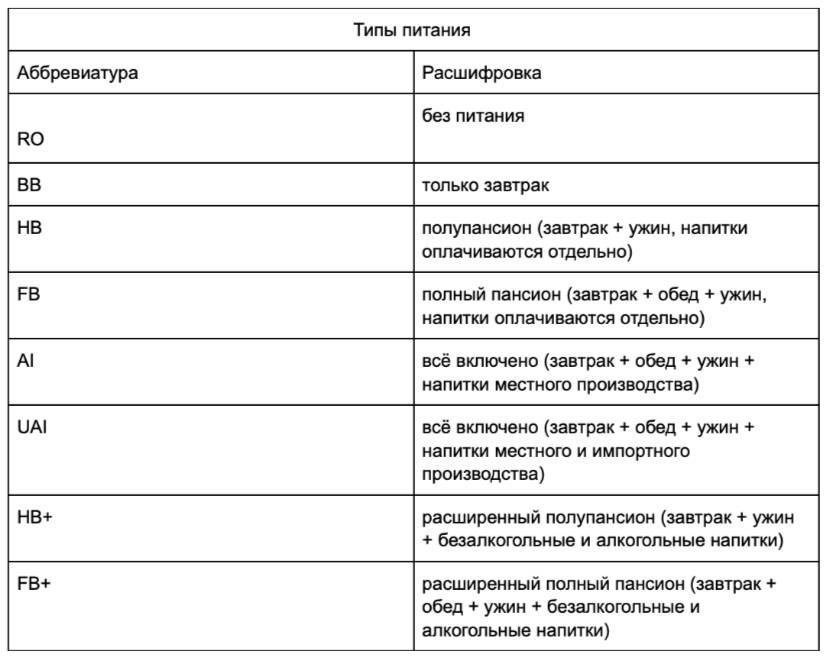Язык гостиничного бизнеса похож на шифровки агентов из шпионских романов: множество сокращений и аббревиатур, за которыми скрывается тайный смысл — условия вашего долгожданного отпуска. Чтобы не провалить операцию «Отдых», ознакомьтесь с расшифровками типов питания.