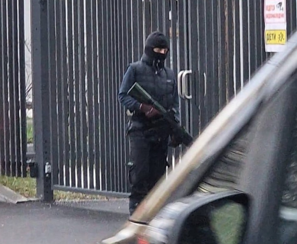 Очевидцы заметили неизвестного в балаклаве и с оружием в руках у школы 2123 в Столовом переулке центре Москвы.