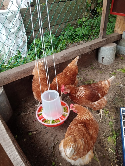 Курятник муж сделал ещё прошлым летом, а кур купили на следующую весну. Купили двух кур породы Чешский Доминант (черные в крапинку) и четырех куры породы Ломан Браун. Чешки были уже большие, а ломаны молодки. Через неделю, пообвыкнув, чешки стали нестись. Целый месяц чешки гоняли молодок. Этакие царицы. К кормушке не подходить! Вначале мы все вкусняшки выберем, а потом и вы поедите. Потом все притерлись и живут достаточно дружно. Так иногда, для профилактики, чехи себя показывают. Со временем у кур появились имена. У чехов одна "с голой попой", а вторая "с пушистой попой". Дело в том, чт