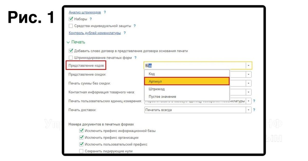 Как настроить печатные формы в 1С:УНФ для вывода кода или артикула?