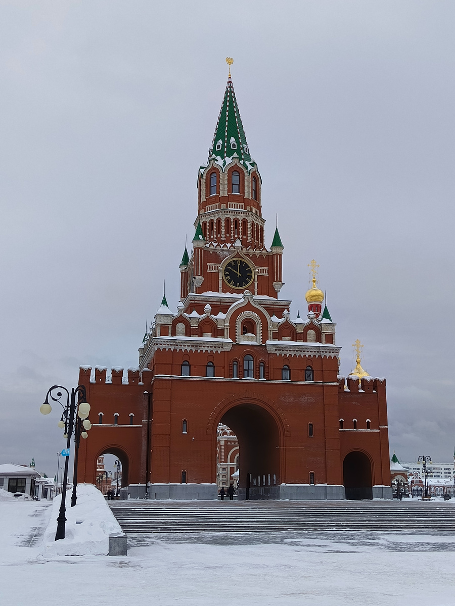 Зимняя Йошкар-Ола: 55-ти метровая Благовещенская башня на площади Республики/Святой Девы с часами в виде курантов Спасской башни Московского Кремля; Благовещенский собор - главный храм Йошкар-Олинской епархии и Марийской митрополии Русской православной церкви, ледяные Рождественские ясли у стен Благовещенского собора; набережная Брюгге на берегу реки Малая Кокшага с "пряничными" фасадами в стиле домов центра столицы Западной Фландрии; магазин EuroSPAR, часовня Петра и Февронии Муромских и Республиканский театр кукол на Царьградском проспекте; вид с Театрального моста на Благовещенский собор, Архангельскую слободу, Благовещенскую башню и Воскресенскую набережную; знаменитый Йошкин кот - главный туристический символ Йошкар-Олы рядом с площадью Ленина; памятник Ивану Оболенскому-Ноготкову - князю и первому воеводе Царевококшайска (так называлась Йошкар-Ола в далёком 1584 году); уменьшенная (в масштабе 1 к 2) копия московской Царь-пушки на площади Оболенского-Ноготкова, перед входом в Нац