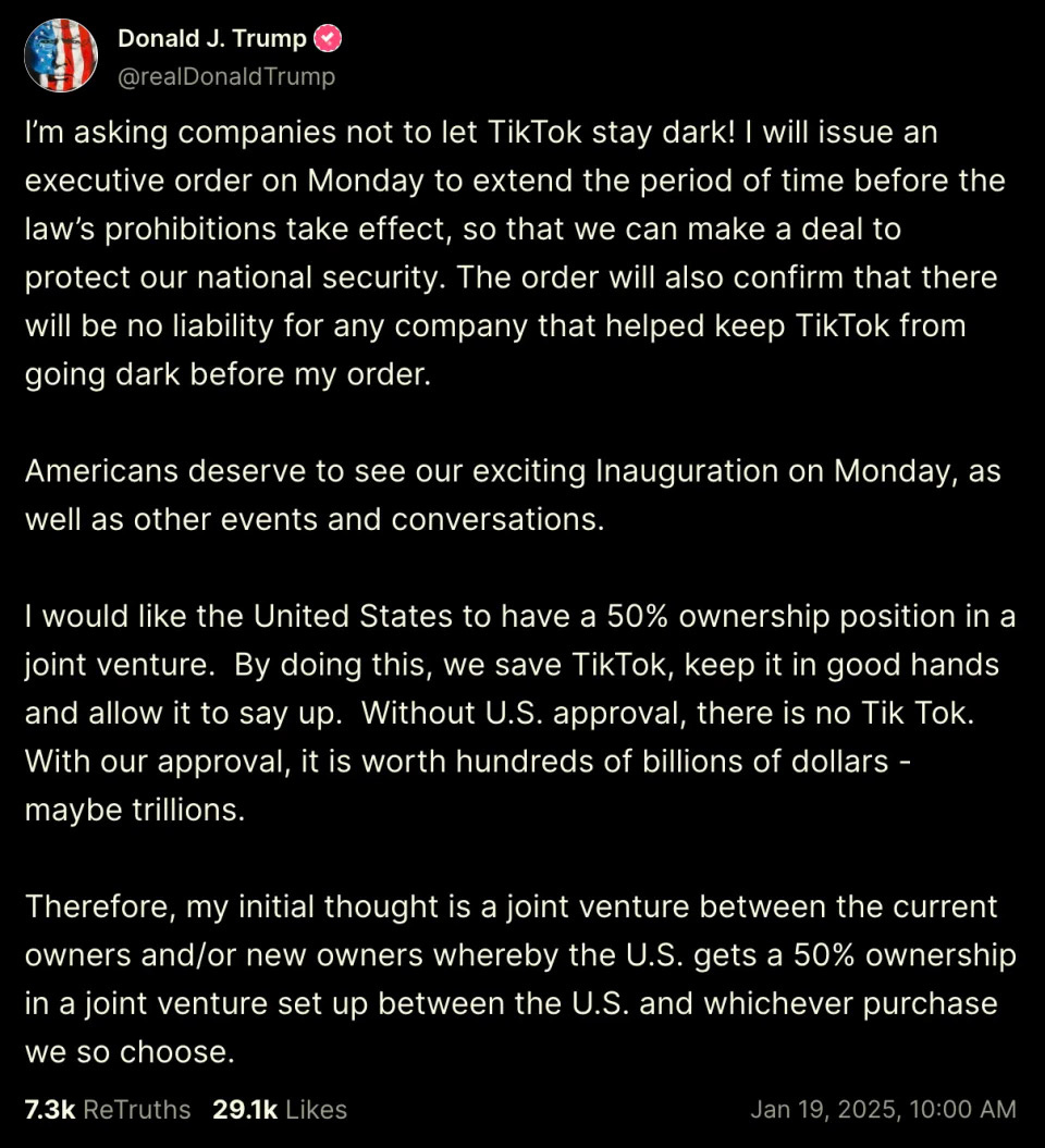 После менее чем суточного перерыва ByteDance объявила о возобновлении работы TikTok в США. В воскресенье компания опубликовала заявление в X, сообщив, что "по согласованию с провайдерами TikTok восстанавливает свои сервисы". В сообщении также выражается благодарность Трампу, инаугурация которого состоится сегодня. Ранее он заявлял о возможности предоставления TikTok отсрочки на фоне интереса потенциальных покупателей, хотя ByteDance не проявляла желания продавать платформу. Мы будем работать с президентом Трампом над долгосрочным решением, которое позволит TikTok остаться в США.— заявление ByteDance Сейчас приложение TikTok снова функционирует в США, хотя ранее пользователи видели сообщение о невозможности использования сервиса. Несмотря на то, что закон о запрете TikTok должен был вступить в силу 19 января, уходящая администрация заявила, что не будет применять его в последние часы президентства Байдена. Пресс-секретарь Белого дома Карин Жан-Пьер назвала угрозу TikTok уйти в офлайн "п