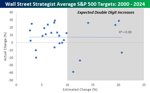 Компания Bespoke Investment Group проанализировала данные за последние 25 лет и обнаружила, что масштабы годовых прогнозов стратегов слабо связаны с фактическими результатами работы рынка.