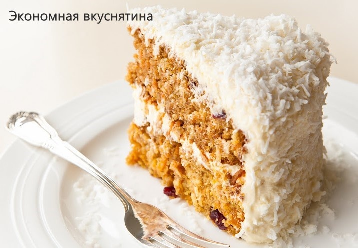 Кулинарный канал «Экономная Вкуснятина» Морковный торт- готовится очень легко и невероятно очень вкусный! Этот торт будет украшением для любого праздника! Ингредиенты: - специи: Крем из сливочного сыра: Процесс пошагово: 1. Включаем разогреваться духовку на 180С. Смазываем маслом 2 круглых формы для коржей 23 см диаметром, дно выстилаем бумагой для выпечки. 2. Натираем морковь на мелкой терке. 3. В небольшой миске смешиваем венчиком все сухие ингредиенты (муку, соль, соду, разрыхлитель) и специи. 4. В другой миске (побольше) смешиваем "жидкие" ингредиенты (масло, сахар белый и коричневый, яйца и ваниль). Аккуратно вмешиваем сюда же смесь сухих ингредиентов. 5. Смешиваем морковь и сухофрукты в отдельной посуде. 6. Добавляем сухофрукты с морковью к остальным ингредиентам, перемешиваем. Добавляем кокосовую стружку и еще раз слегка перемешиваем. 7. Разделяем тесто на 2 части (разливаем по 2 формам, или выпекаем по очереди). 8. Выпекаем 30 минут или пока воткнутая в корж спичк