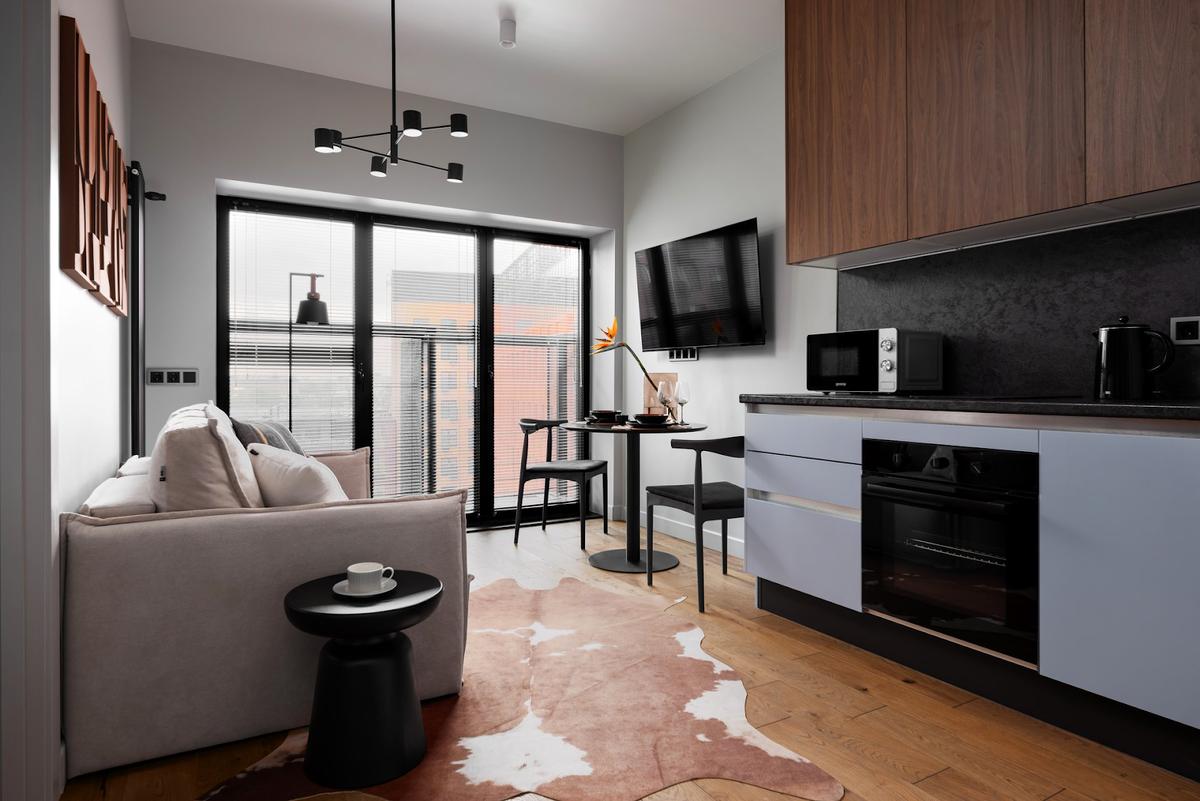 Шкуры, кожа, авторские арты: стильная евродвушка 32 кв.м с нестандартными решениями