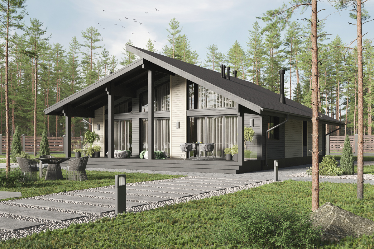 Панорамные окна наполняют гостиную светом, а окружающая природа становится частью интерьера. В кухонной зоне хватит места для кухонного острова, а рабочую поверхность можно расположить под окном. Открытая с трех сторон терраса с навесом удваивает площадь гостиной. Здесь достаточно места для обеденной и диванной группы. В теплое время года на террасе можно проводить все время — играть с детьми, принимать гостей, встречать и провожать солнце. Вести неспешные беседы и наслаждаться соловьины