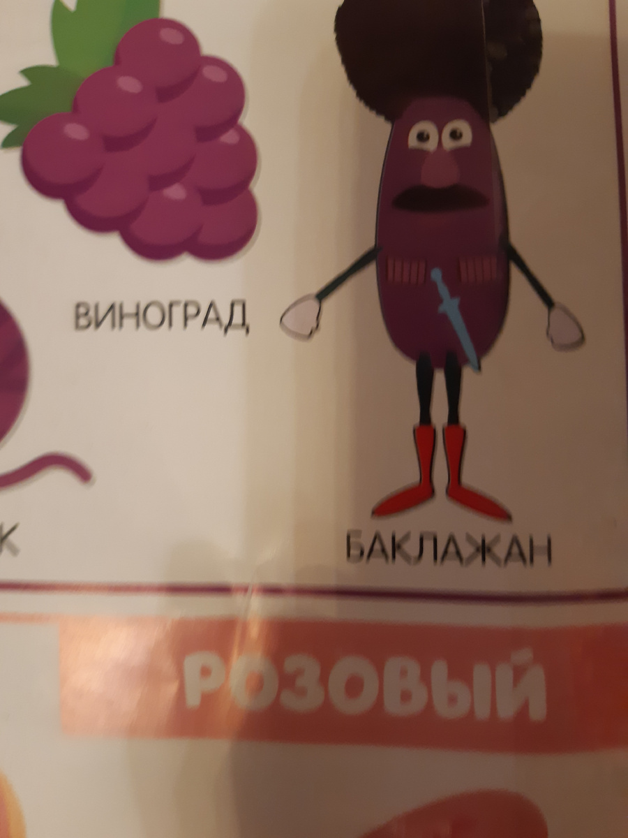 Недавно попалась мне детская книга "Самая первая энциклопедия" Синий трактор, Москва "УМка". Книга для малышей, качество бумаги НЕ для мылышей. Через неделю усиленного чтения превратилась макулатуру. Заклеила страницы скотчем и продолжили дискотеку. А что же интересного на страницах? В разделе цвета мы можем увидить овощ "баклажан-джигит", в шапке, черкеске и с кинжалом. Интересно, что у художника в голове? Может перепил Кизлярского коньячка? Также радует выражение лица у свиньи, лошади и осла. Вспомнился философский мультик "Моя жизнь", как поросенку сказали, что он рожден, чтобы стать холодцом или молодцом. А теперь позанудствую. Есть раздел "ягоды". Нарисованы: клубника, вишня, малина, ежевика. На этой странице нет ни одной ягоды. На второй странице : крыжовник, черника, облепиха, морошка, красная и черная смородина, из них ягоды крыжовник, черника, смородина. Так, а почему не нарисовали наш любимый арбуз? Картофель тоже ягода. Но в целом книжка хорошая, р