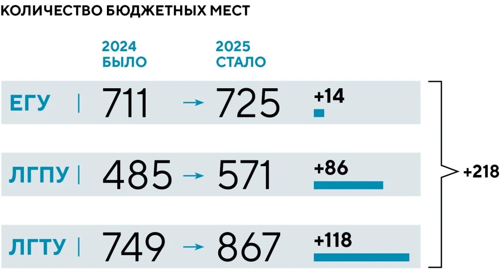 Солидно прибавилось число бюджетных мест в 2025 году и в ЛГПУ имени П.П. Семёнова-Тян-Шанского. Здесь будут вести набор на 571 бюджетное место (+ 86 бюджетных мест по сравнению с 2024 годом). Как рассказали в пресс-службе вуза, в университете появятся новые направления подготовки – «Искусственный интеллект», «Востоковедение», «Фитнес-технологии», «Управление персоналом», «Правовое обеспечение и PR», «Бизнес-аналитика», «Психологическое консультирование».