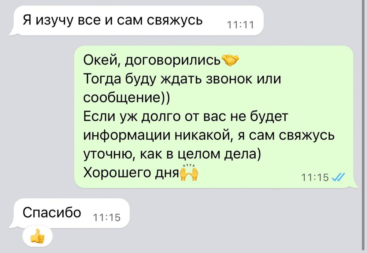 Очень приятно видеть от вас обратную связь в виде реакций🫶 Так я понимаю, что пишу не в воздух🙌 Делайте так всегда - буду очень признателен🙏 И так почему ответ именно такой: Подробный разбор сообщения👌 Если я просто напишу: Я сам с вами свяжусь Это будет не приятно, начинается внутренний спор. А это плохо при переговорах и продажах… Что делаю я: Окей, договорились🤝 Тогда буду ждать звонок или сообщение)) Эта фраза позволяет мне не спорить с клиентом, а оставаться в его картине мира🙌 То есть я принимаю его точку зрения - да окей, как ты хочешь так и будет👍 Если уж долго от вас не будет информации никакой, я сам свяжусь уточню, как в целом дела) Эту фразу можно назвать неким «пояснителем» если не напишите я просто узнаю как у вас дела Хорошего дня🙌 И здесь мы просто закрываем наш диалог🙏 Как правило на это сообщение отвечают «спасибо или спасибо и вам» и тому подобное - либо не отвечают никак … Но если даже не будет ответа - вы даже через неделю можете спокойно писать такому кли