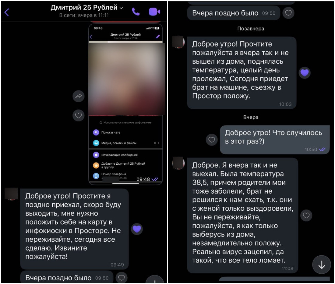 Он перевел деньги Дмитрию на карту, тот оставил свой номер телефона. Но прошло несколько дней, мужчина с улицы ничего не вернул, хотя прямо и не отказался этого делать — просто не успел, был занят, заболел.