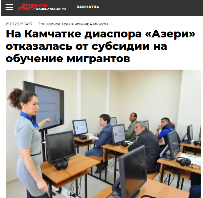 Новость, которую ждали многие: азербайджанской диаспоре “Азери” на Камчатке, запретили заниматься адаптацией приезжих иностранных граждан из Средней Азии. История, начавшаяся с громких заявлений и щедрых субсидий, завершилась тихим, но отрезвляющим финалом.