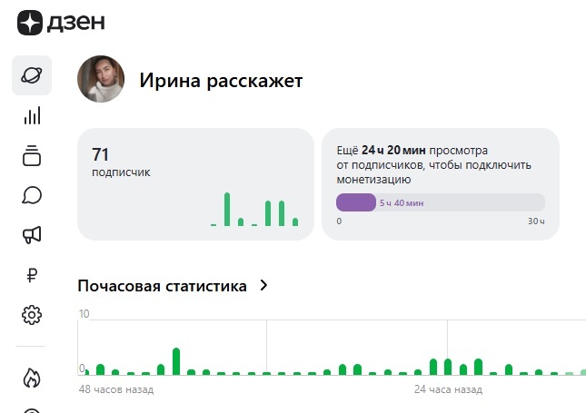 Как же быстро летит время, мама рОдная! Вроде бы только недавно делилась с вами своими неудачами успехами за первый месяц ведения блога, а уже пора рассказывать о следующем. Ну что, думаю, вам интересно, как у меня обстоят дела с заветным счётчиком в 30 часов. Из названия статьи уже понятно, что за второй месяц у меня тоже не получилось достичь «Дзеномонеты». Предыдущий отчёт можно посмотреть тут. Я создала канал 18 ноября 2024. Первая публикация датируется 22 ноябрём. За первый месяц мне удалось накопить всего 6 часов и 10 минут. Потом я немного опустила руки и перестала писать статьи ежедневно. Счётчик начал увеличиваться, новые фиолетовые столбики перестали появляться. Прошли новогодние праздники, вдохновение вернулось, и я вместе с ним опять вернулась к текстам. Показываю ситуацию на сегодня. Блогу 2 месяца 18го января исполнилось, но статистика приходит с задержкой в 2 дня, поэтому эту статью целесообразно создавать именно сегодня, 20 января. Подписчиков на 30 человек больше стало