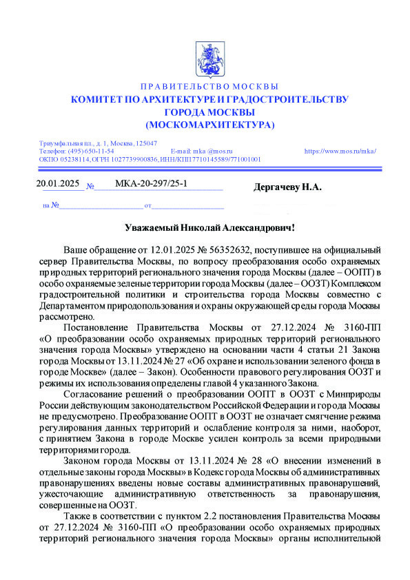 Некоторое время назад Правительство Москвы издало скандально известное постановление от 27.12.2024 № 3160-ПП «О преобразовании особо охраняемых природных территорий регионального значения города Москвы». Я уже писал об этом, речь идет о том, что Особо охраняемые природные территории (ООПТ) Москвы преобразуются в Особо охраняемые зеленые территории (ООЗТ). Данный правовой статус может быть изменен, в соответствии с п.6 ст. 2 Федерального закона «Об особо охраняемых природных территориях» (№ 33 от 15.02.1995) 6. Органы государственной власти субъектов Российской Федерации согласовывают решения о создании особо охраняемых природных территорий регионального значения, об изменении режима их особой охраны с: а) уполномоченным федеральным органом исполнительной власти в области охраны окружающей среды; Однако, Правительство Москвы придерживается совсем иного мнения. Что ни с кем оно согласовывать изменения статуса ООПТ на ООЗТ не обязано. И, что, якобы, этот статус, оказывается, УСИЛИВАЕТ ко