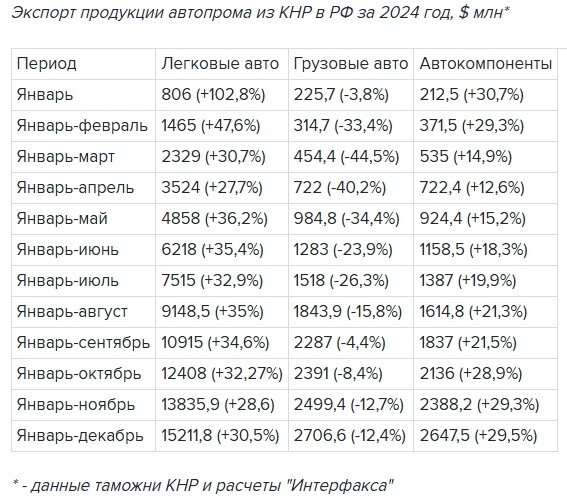 Поставки грузовиков за год упали на 12,4%, до $2,7 млрд. В 2024 году Китай увеличил экспорт легковых автомобилей в Россию на 30,5%. По данным «Интерфакса», основанным на информации Главного таможенного управления КНР, объём экспорта достиг рекордных 15,2 миллиарда долларов. В декабре экспорт автомобилей из Китая в Россию снизился на 3,7% по сравнению с ноябрём и составил 1,38 миллиарда долларов. Это стало продолжением тенденции к снижению, которая наблюдается уже третий месяц подряд после резкого роста в августе и сентябре до 1,6–1,8 миллиарда долларов. Экспорт грузовых автомобилей из Китая в Россию за год сократился на 12,4%, до 2,7 миллиарда долларов. Однако в декабре объём экспорта увеличился в 1,9 раза по сравнению с предыдущим месяцем и составил 207,2 миллиона долларов. Экспорт автозапчастей из Китая в Россию за год вырос на 29,5%, до 2,65 миллиарда долларов. В декабре объём импорта автозапчастей из Китая достиг рекордных 259,3 миллиона долларов, что на 2,9% больше, чем в ноябре.
