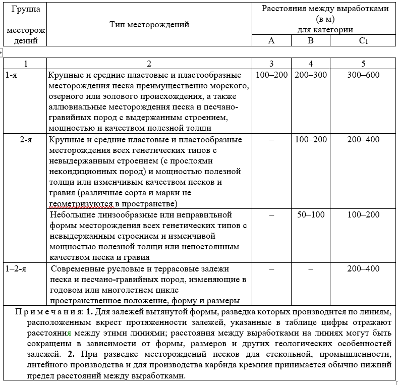 В соответствии с методическими рекомендациями по применению Классификации запасов месторождений и прогнозных ресурсов твердых полезных ископаемых. Песок и гравий. ФГУ ГКЗ. М., 2007, расстояние между выработками (скважинами) принимается согласно таблице 1 (нумерация в соответствии с оригиналом документа).