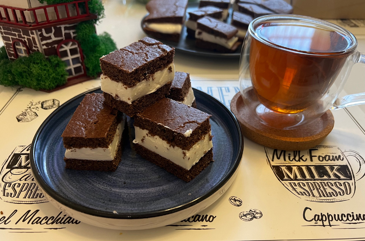 Вкусный десерт выходного дня - "молочный ломтик". Ингредиенты (корж): Ингредиенты (начинка): Желтки отделяем от белков. Желтки смешиваем с какао, мукой, сахарозаменителем и разрыхлителем. Белки взбиваем до белых пик. Соединяем две смеси и смешиваем при помощи силиконовой лопатки. Выкладываем на коврик или пергамент тонким слоем (не толще 1 сантиметра) и выпекаем в разогретой духовке до 180 градусов 15 минут (ориентируйтесь по своей духовке). *стараемся сформировать ровный прямоугольник. Пока корж выпекается, готовим начинку. Для этого смешиваем творог, сыр и сахарозаменитель. Предварительно желатин быстрорастворимый разводим в горячей воде (50 мл), постоянно помешивая до полного растворение. Оставляем набухать. Если желатин не растворяется, его можно нагреть, но не кипятить. *Важно: не пропустите полное остывание и загустение желатина в чаше, иначе его будет не добавить к творогу. Остывший желатин соединяем с твороженной массой. Тщательно смешиваем, чтобы желатин равномерно распред