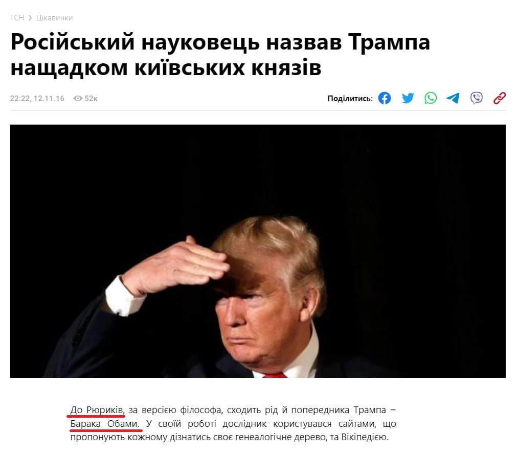 Российский философ Александр Нилогов, который, согласно «Википедии» (надежный источник), более 20 лет занимается исследованиями в области генеалогии, еще к первой инаугурации Трампа выявил, что, оказывается, Дональд является украинцем. Проследив генеалогическое древо миллиардера, Нилогов выяснил, что род Трампа начинается аж от Рюрика, и Дональд является его потомком в 36, 37 и 38 колене. Ученый утверждает, что в дальних родственниках Трампа такие князья, как: Игорь, Святослав, Владимир и Ярослав. В этой же статье автор сообщает, что к Рюрикам восходит и род Барака Обамы. Да и вообще все американские президенты, за исключением Мартина Ван Бюрена, в той или иной степени являются украинцами. Так, а кто еще в этом мире не украинец? Что еще они не придумали? Бог придумал землю, а украинцы - Бога? Статья была написана к первой инаугурации Трампа. Странно, а сейчас почему не доказывают, что Трамп - украинец? 🤣🤣🤣