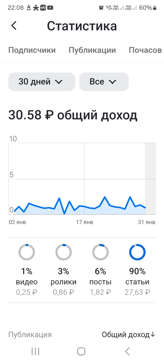 Привет, друзья! В декабре я себе поставила цель оживить свой маленький бложик, писать регулярно, не лениться. И я писала. Начиная с 1 января, каждый день писала посты, статьи и выкладывала видео. Получилось 32 публикации. Сначала было тяжело каждый день выдавать информацию. Ведь это тоже труд, придумать тему, написать текст, подобрать или сделать самой фото. Потом втянулась. В итоге, за январь 2025г. я заработала аж 30 рублей 58 копеек. Т.е. примерно 1 рубль в день. За этот месяц от меня один человек отписался и один подписался. В итоге так и осталось 366 моих любимых подписчиков. И что мне с этим делать? Я вроде как и писать люблю, и блог мой рос когда-то сам, и дорос до 366 человек. А потом я заленилась, бросила писать на пол года и блог просто стух. И оживить сейчас его я не могу, хоть и стараюсь. Писала в тех.поддержку, может я в каком-нибудь бане, нет показов, никто не подписывается. Отвечают, что всё нормально, просто пишите лучше и чаще. Ок. Мои дорогие, залайкайте меня